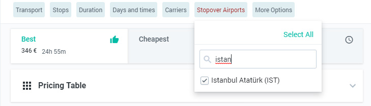 I like using Kiwi a lot as it has many advanced search tools. Kiwi also offers results no other search engine has, because it is able to combine separate single tickets into one fare, which can be cheaper than a return with the same airline.